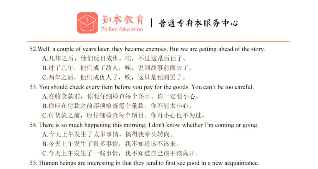 湖北专升本英语阅读理解大部分考察的都是同义词近义词,知本也曾汇总过157组专升本英语同义词近义词(点击查看),掌握这些,能帮助你快速看出题干和原文中的同义之处,是非常聪明的英语解题技巧