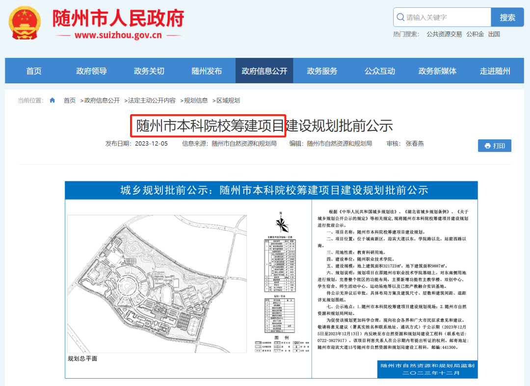 上个月,随州市政府发布了《随州市本科院校筹建项目建设规划批前公示》,意味着随州市没有本科院校的历史即将结束。
