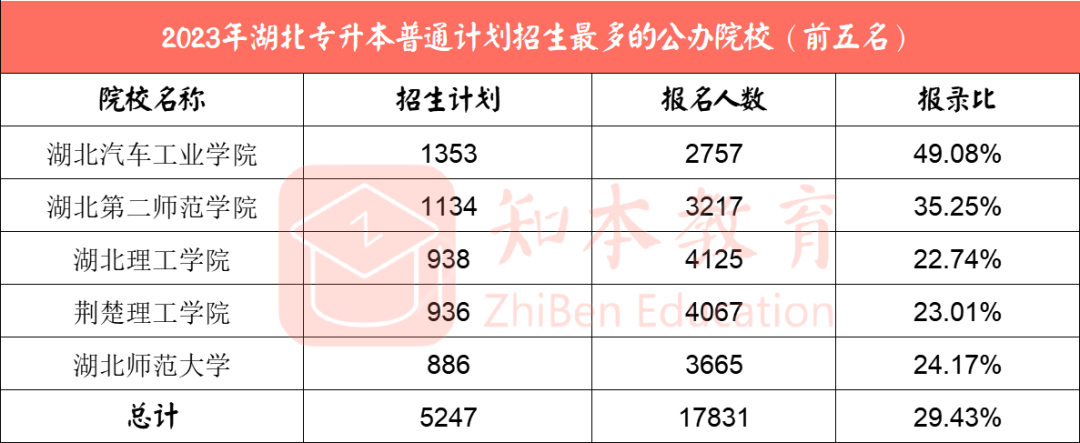 除湖北汽车工业学院外,普通计划最多的其余四所院校的报录比都在35%以下,整体报录比不到30%左右,上岸难度较大。